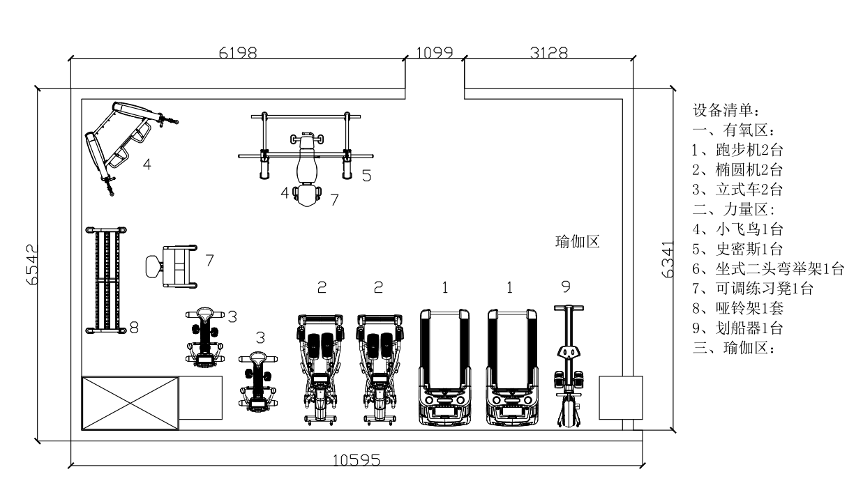 本次健身房器材配置方案適用于68平來左右的企業(yè)健身房,先來看一下器材的布置圖: